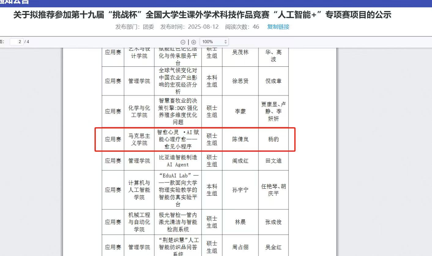 近日,从第十九届“挑战杯”全国大学生课外学术科技作品竞赛“人工智能+”专项赛道传来喜讯,马克思主义学院陈倩岚同学的团队项目“智愈心灵。AI赋能心理疗愈—愈见小程序”在院赛中荣获一等奖,并成功通过校赛选拔,获得推优进入国赛资格。这一创新项目将人工智能技术与心理健康领域深度融合,展现了科技赋能社会福祉的无限可能。