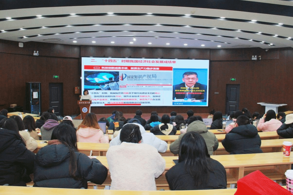 邹茜首先介绍了党的二十届四中全会的基本情况,系统梳理了“十四五”时期我国经济社会发展取得的十二方面重大成就,针对“十五五”时期国内外发展形势,她指出:“我国发展仍处于战略机遇和风险挑战并存的时期,必须充分发挥四大优势,紧扣七大板块精准发力,以自身工作的确定性有效应对外部环境的不确定性”。在解读“十五五”行动纲领时,邹茜重点阐述了《建议》中提出的指导思想、基本原则、发展目标以及十二项重要部署。在谈到科技创新时,邹茜以学校全国重点实验室的建设发展为例,阐释了我国科技创新体系从“制造中心”向“创新中心”的历史性跨越,生动体现了我国科技创新体系日益完善、科技成果转化显著加速的高质量发展态势。最后,邹茜对马院学子提出三点期望:一是精研理论、筑牢信仰,做思想上的“先行者”,通过系统深入“学”,联系实际“思”,旗帜鲜明“讲”,在“学深悟透”上达到新高度;二是聚焦专业、练就本领,做学业上的“深耕者”,通过构建复合型知识体系,强化实践与研究能力,锤炼严谨求实的学风,用坚实的专业能力作为支撑;三是胸怀天下、投身实践,做行动上的“实干者”,通过将个人规划融入国家坐标,从身边小事践行担当精神,勇于在挑战中磨砺成长,在时代洪流中书写无悔青春。