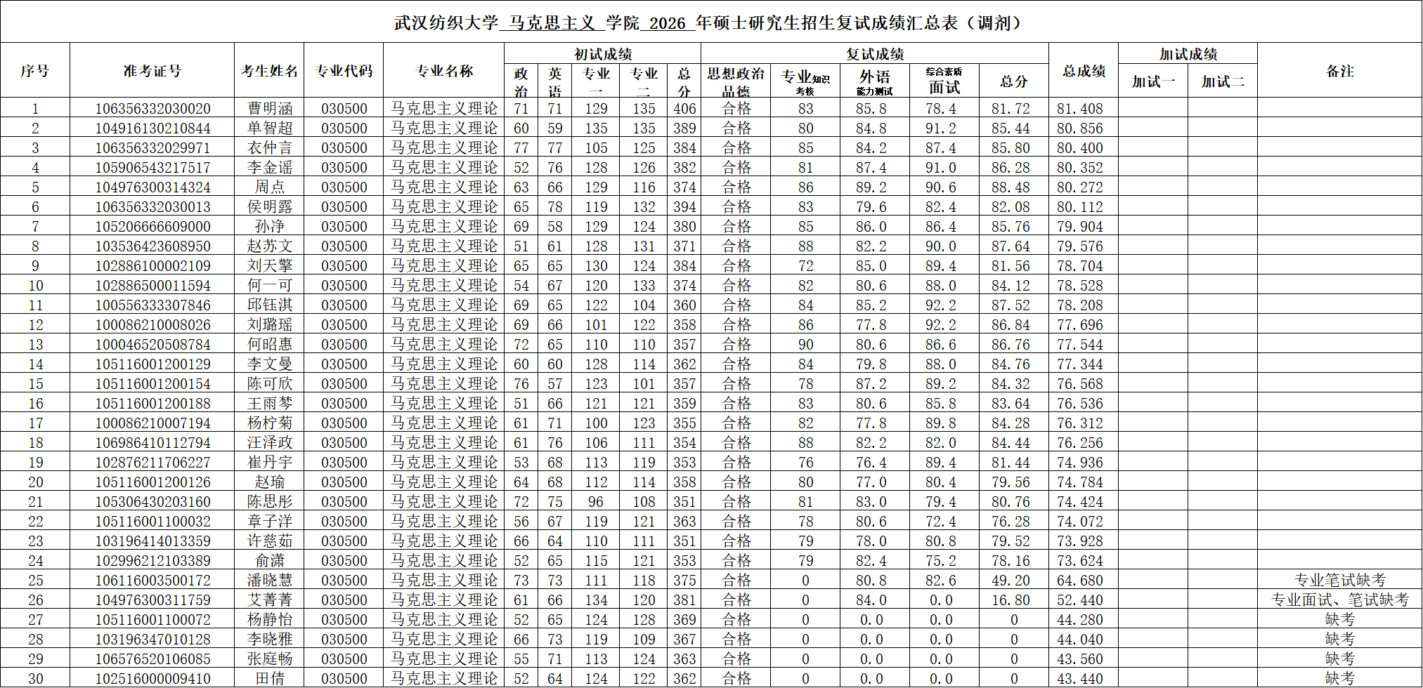 武汉纺织大学马克思主义学院 2026 年硕士研究生招生复试成绩公示(调剂)