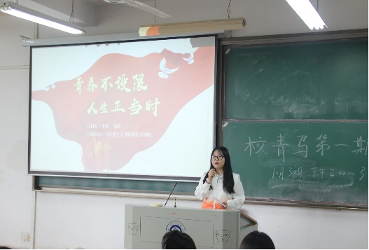 为深入推进青年马克思主义者培养工程,引导青年学生骨干坚定理想信念,10月30日下午,武汉纺织大学“青马”班第一期培训在阳光校区3号楼218教室举行。本次培训由马克思主义学院“初心”宣讲团围绕“青春不设限,人生正当时”主题展开宣讲,“初心”宣讲团学生骨干梁爽主持,宣讲团成员李念、徐梦主讲,学校“青马”班全体学生骨干参加。