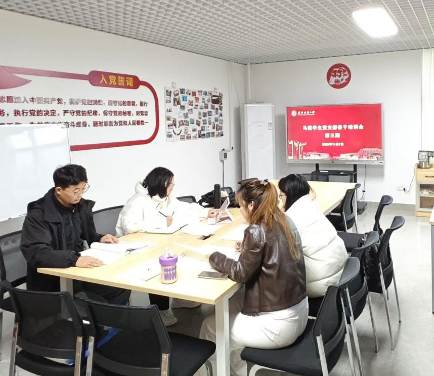 11月7日上午,马克思主义学院在15栋研究生公寓四楼“一站式”学生党建共享社区为学生党支部骨干进行了第三期专题培训暨学习总结会。学生党员骨干研究生党支部副书记陈怡主持培训会。