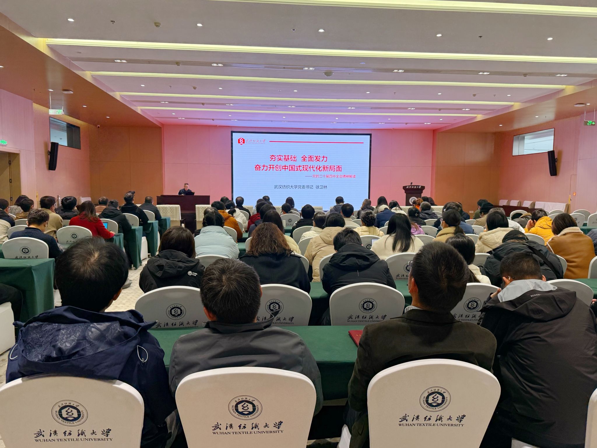 为深入学习宣传贯彻党的二十届四中全会精神,根据校党委统一部署,12月18日下午,校党委书记徐卫林院士以《夯实基础 全面发力 奋力开创中国式现代化新局面》为题,为马克思主义学院和纺织新材料与先进加工技术全国重点实验室师生作党的二十届四中全会精神专题宣讲报告。报告会由马克思主义学院党委书记邹茜主持。
