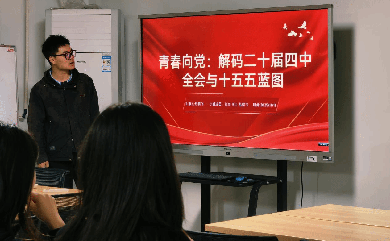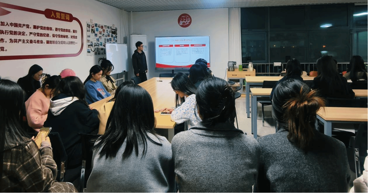 为深入贯彻党的二十届四中全会精神,引导青年学生准确把握国家发展蓝图,11月11日晚,武汉纺织大学马克思主义学院团支部在阳光校区15栋学生宿舍“一站式”党建共享社区举办11月主题团课。本次团课由团支部成员彭鹏飞同学主持,学院全体团员积极参加。